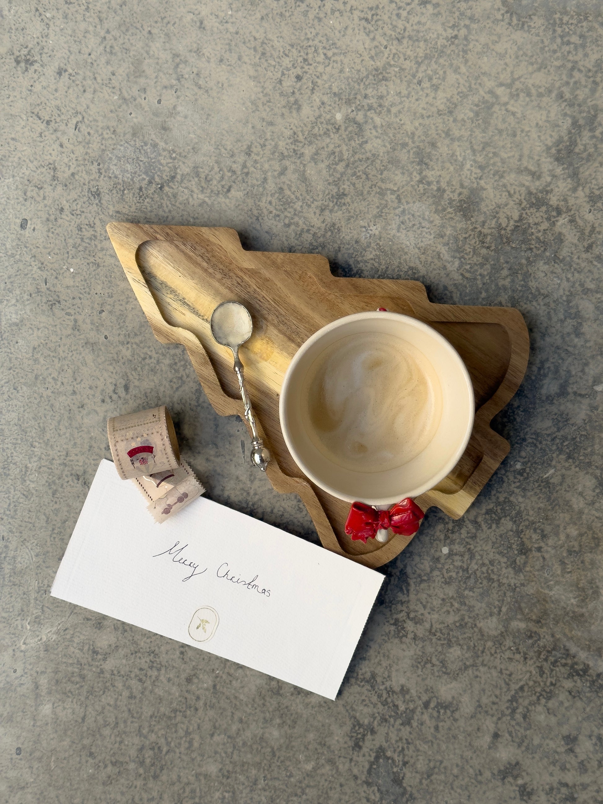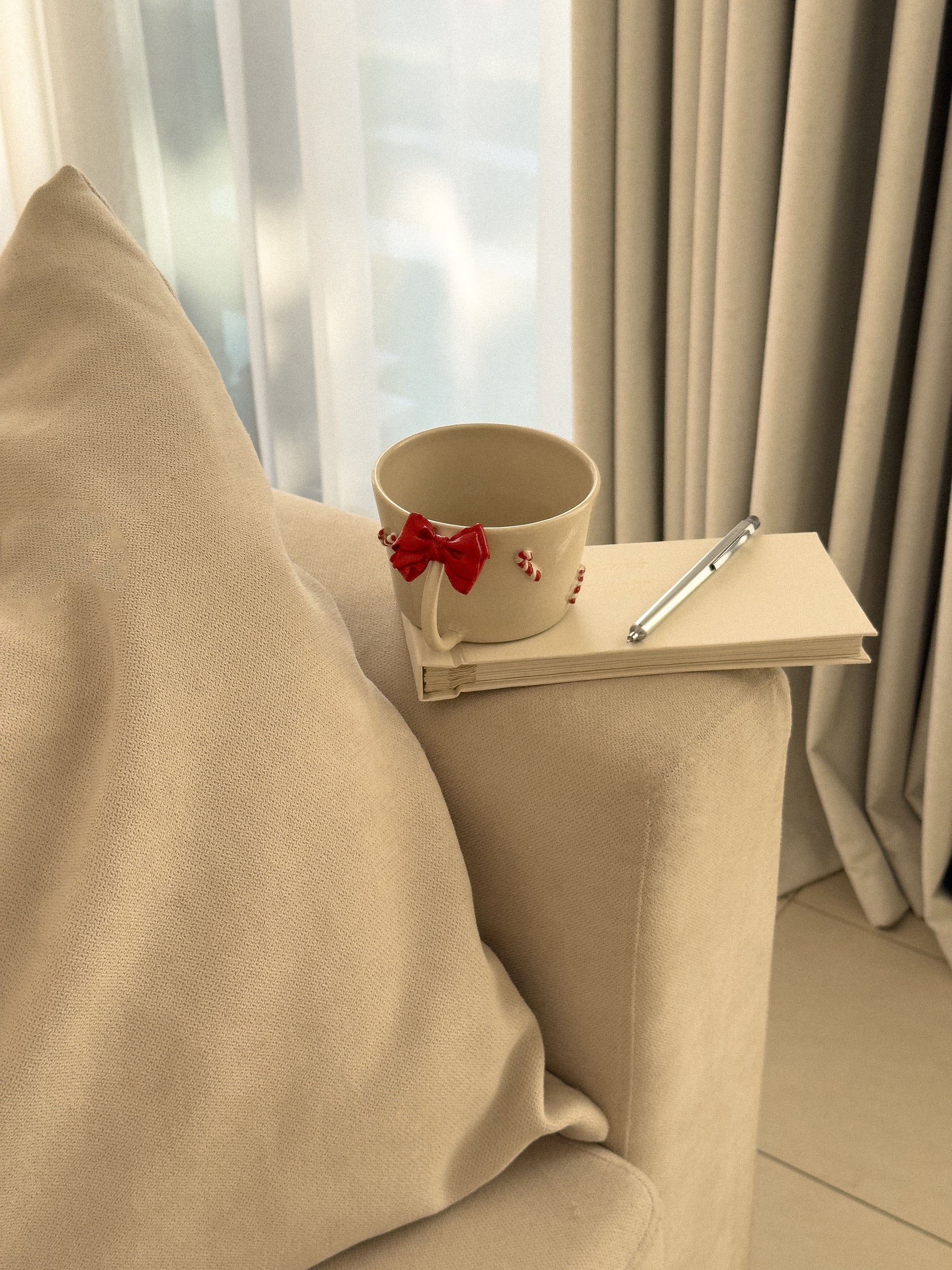 Our Candy Cane Bow Mug in a new off-white colourway, featuring our candy cane detailing & our classic handle bow in red. Each mug is handmade and painted by hand. A sweet, nostalgic keepsake to sip from year after year.