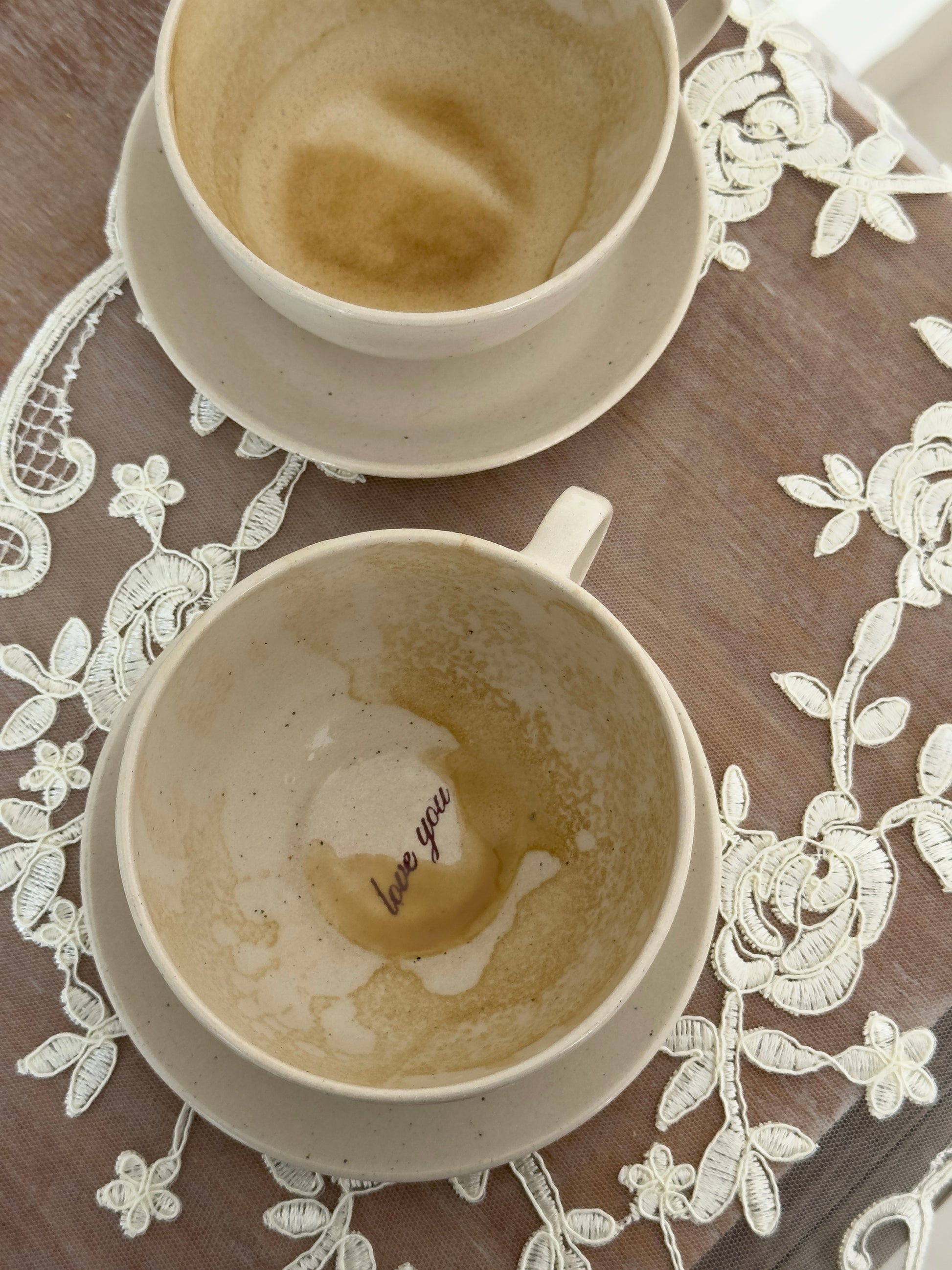 The Heirloom Mug. A timeless silhouette that feels borrowed from another era, one that could have lived on your shelf decades ago. Finished with a classic script, made as his & hers, and a sweetmessage waiting at the bottom of the cup. Made for two.